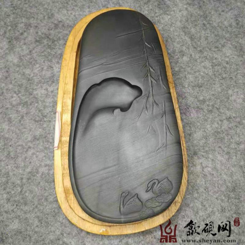 【描述】老坑线眉,清新淡雅,轻柔曼妙,石质纯净,轻轻雕刻几笔,轻风拂柳,双鹅嬉戏,一幅柳下嬉鹅图跃上砚上!实用收藏之精品传世之作!