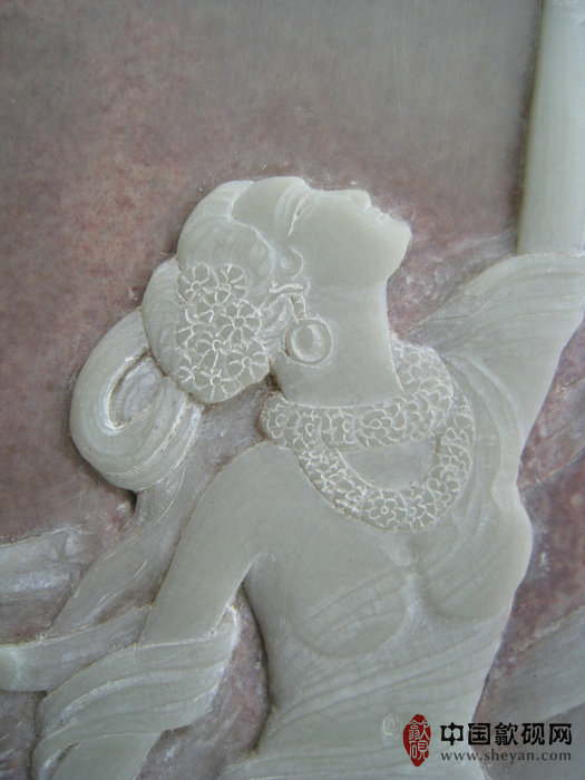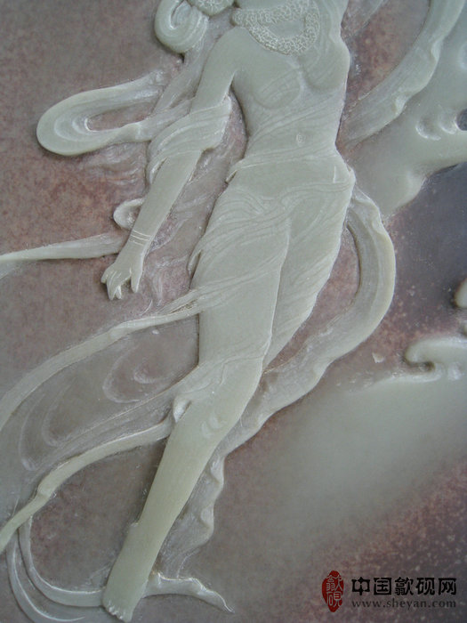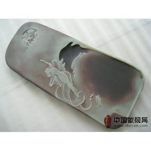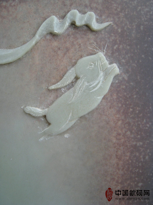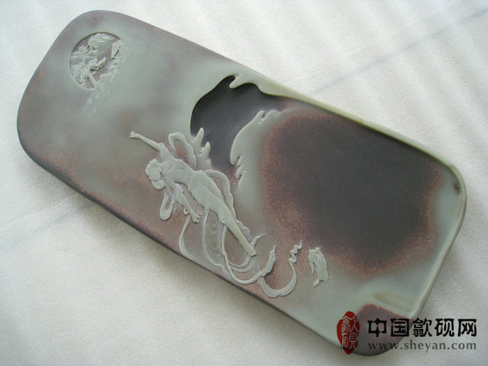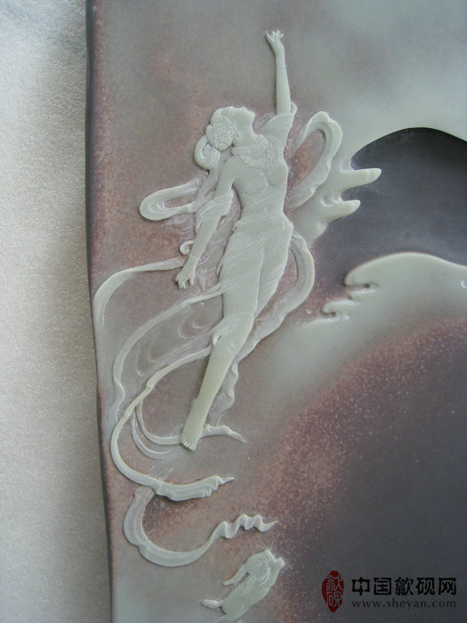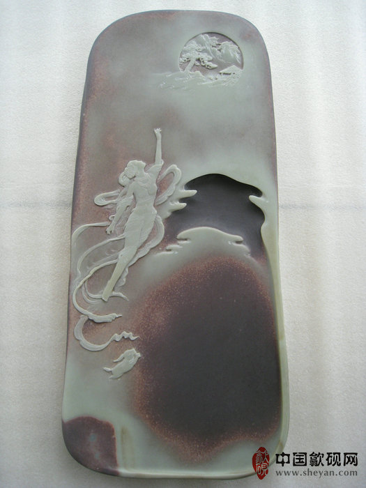 【描述】此砚纹理极其出众,紫玉相间,玉色纯净,恰到好处。石质纯净,雕刻精美,恰当运用紫色玉色制造出云雾状,嫦娥抬头举手动态十足,身段婀娜多姿,发丝绸带飘逸,在月光之下,云雾之中不断飞升,薄薄绸缎飘浮在嫦娥身上,十分漂亮,嫦娥之美丽,玉兔之精灵,传说之神秘,顿现美石之上,令人赞叹不已,实乃绝品,不可复制!