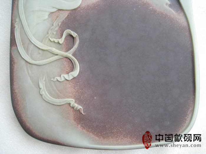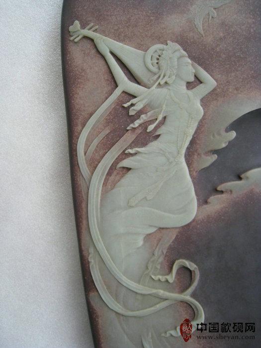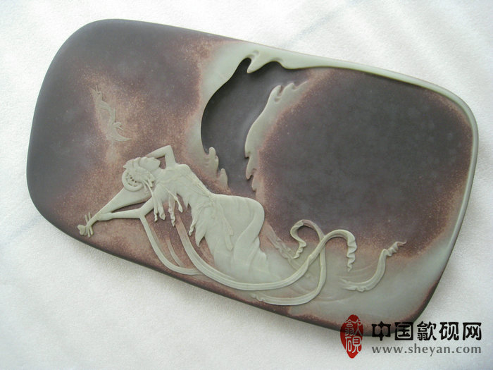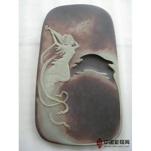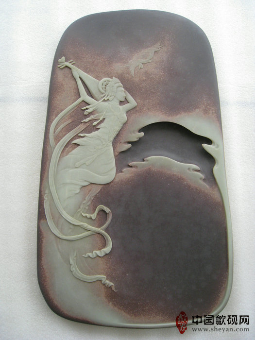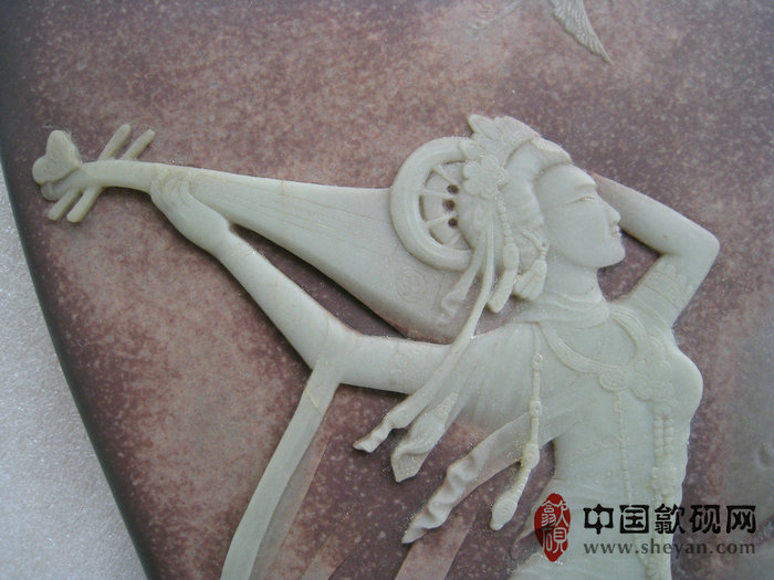 【描述】此砚纹理极其出众,紫玉相间,玉色纯净,恰到好处。琵琶仙子,驾着祥云,伴着仙鹤,反弹琵琶,翩翩起舞,十分飘逸唯美。人物表情极为生动细致,整体意境如诗如画,让人心驰神往,意境品相绝佳,收藏送礼之佳品!!