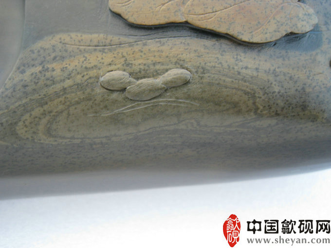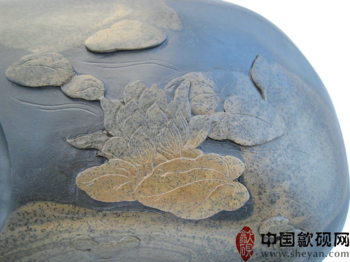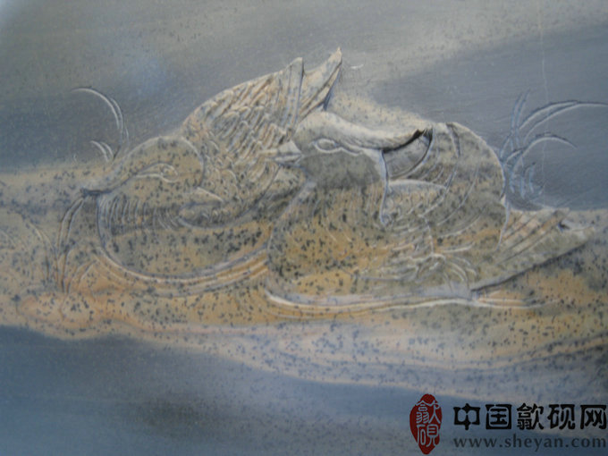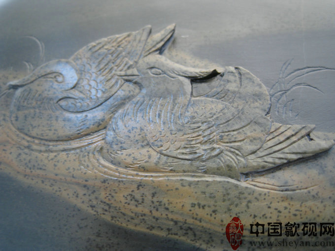 【描述】漂亮的金晕纹理,精美的雕刻,尺寸厚实。鸳鸯在荷塘中嬉戏,悠然自得,意境绝佳。收藏实用之佳品!