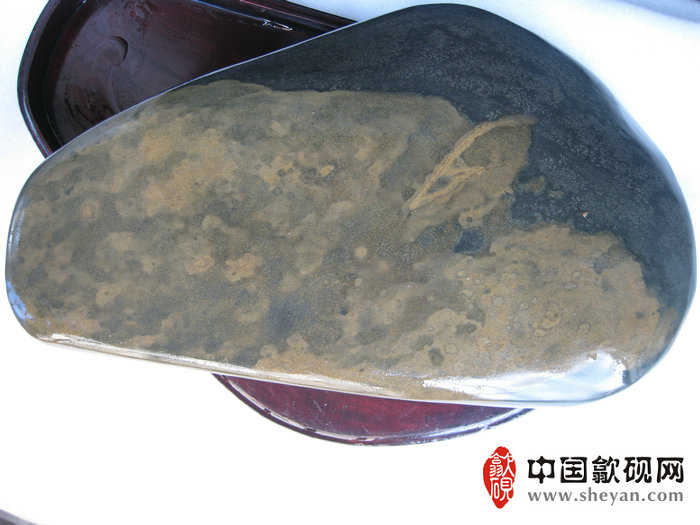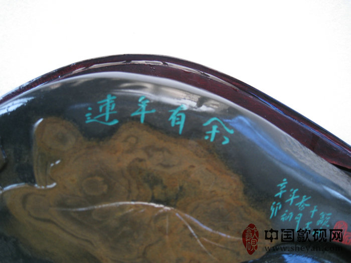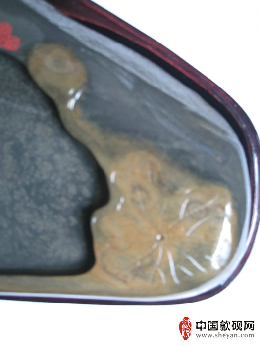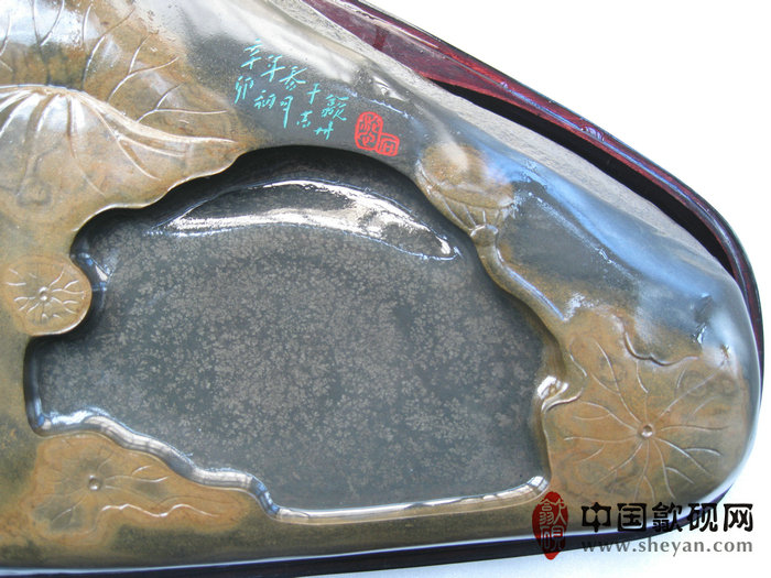 【描述】此砚纹理美妙,天然而生的金晕纹理,轻轻几笔,便赋予几朵盛开的荷叶,两条金鱼的灵性。金鱼悠然自得,畅游于水中,点点银花又似岸上的落花落于水面,整体意境绝佳,喻意着年年有鱼,收藏送礼之佳品!!