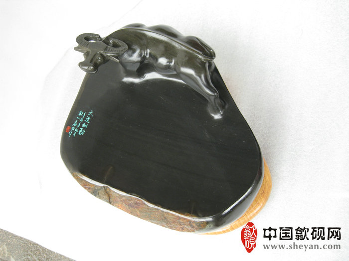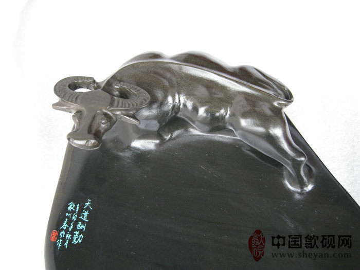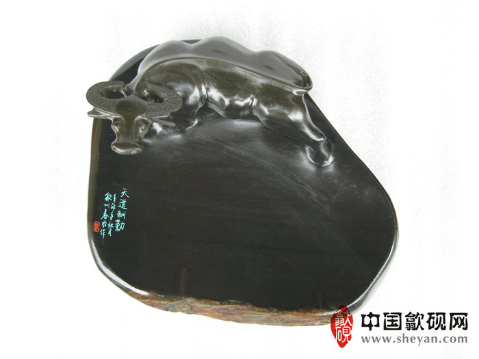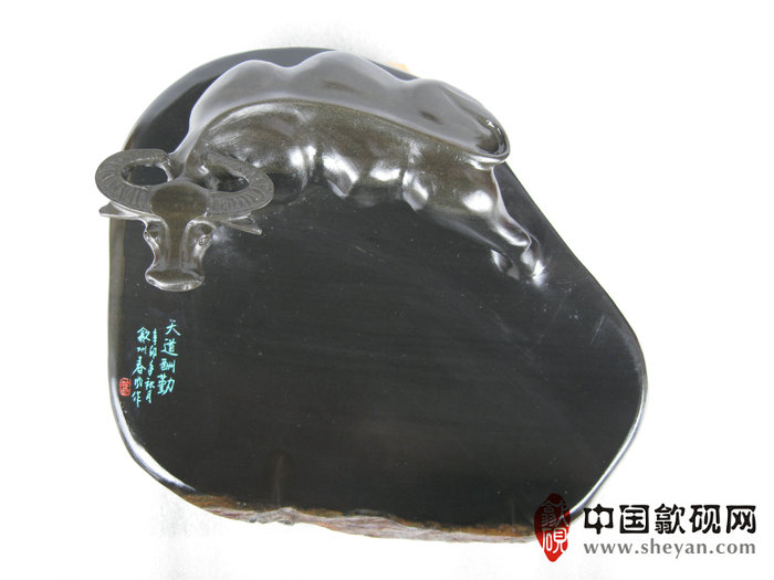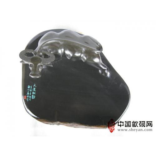 【名称】水坑金晕石天道酬勤小牛砚