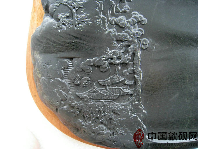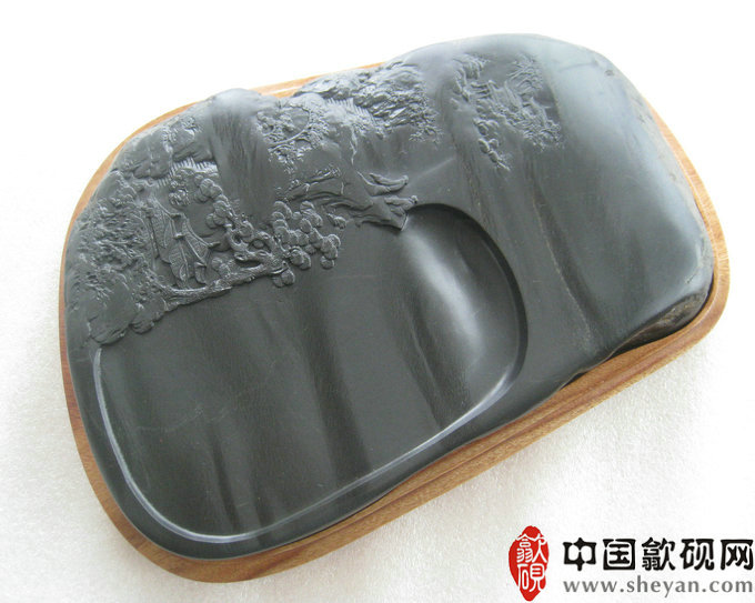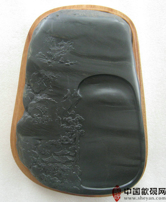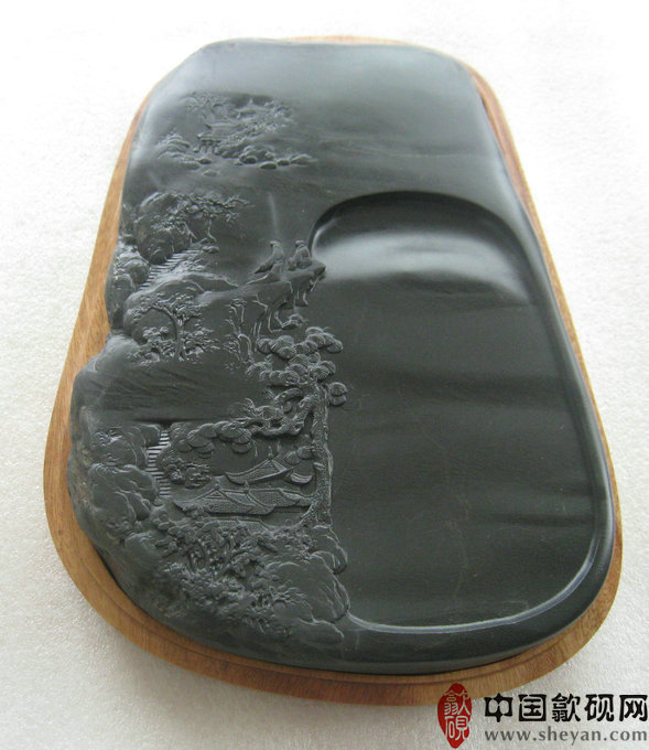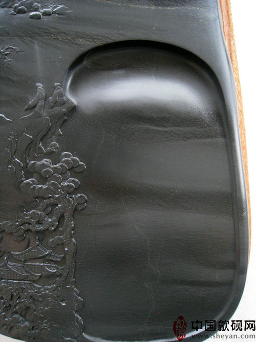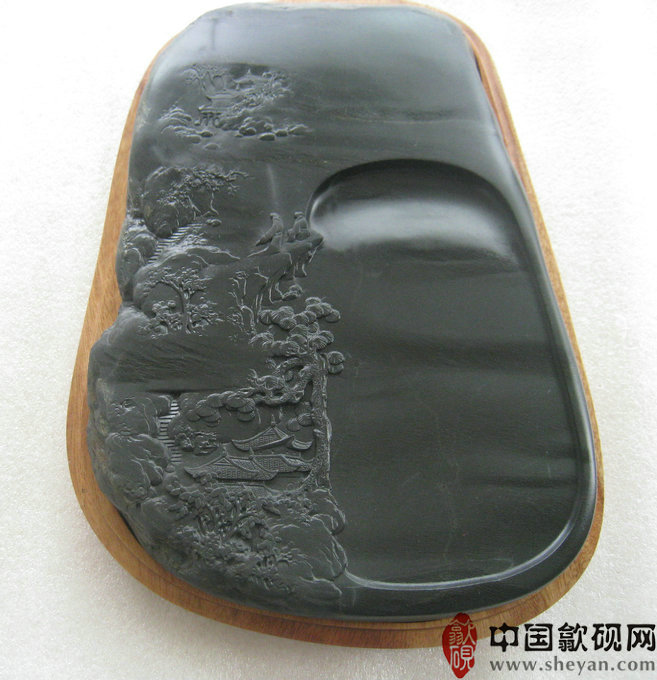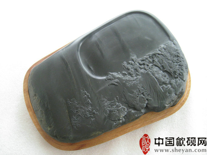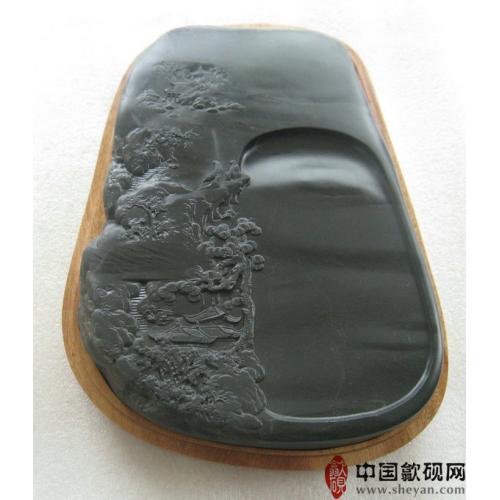 【描述】老坑眉纹,并有稀少的老坑凤尾眉,十分罕见。石质细腻纯美,双面雕刻,工艺精湛。山水风韵的意境十分悠然,尤为考究雕工技巧。此乃收藏、传世之绝品佳砚!