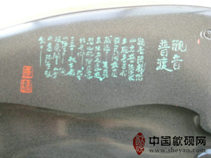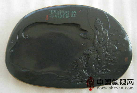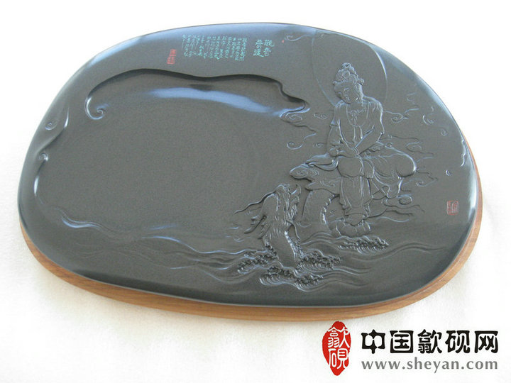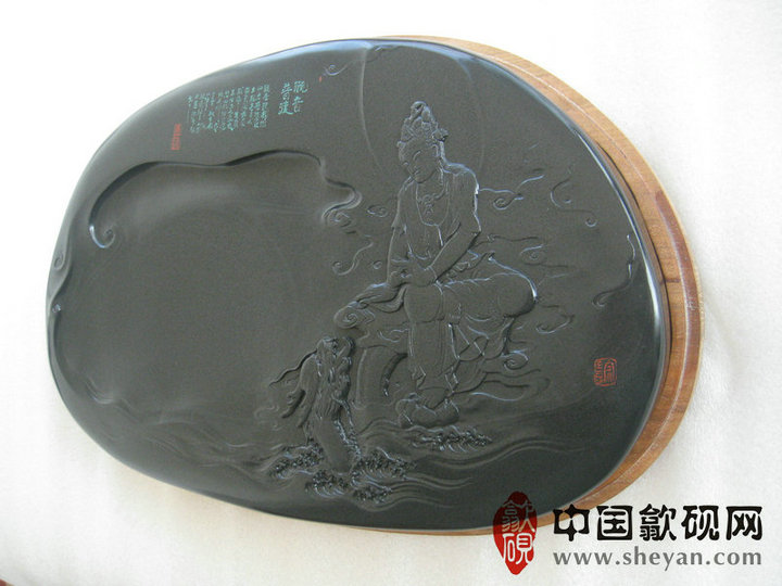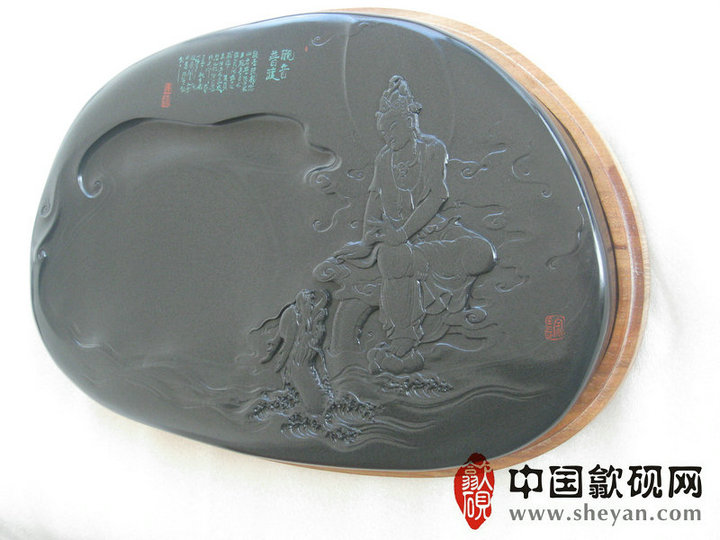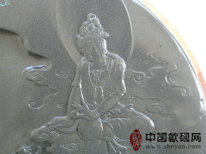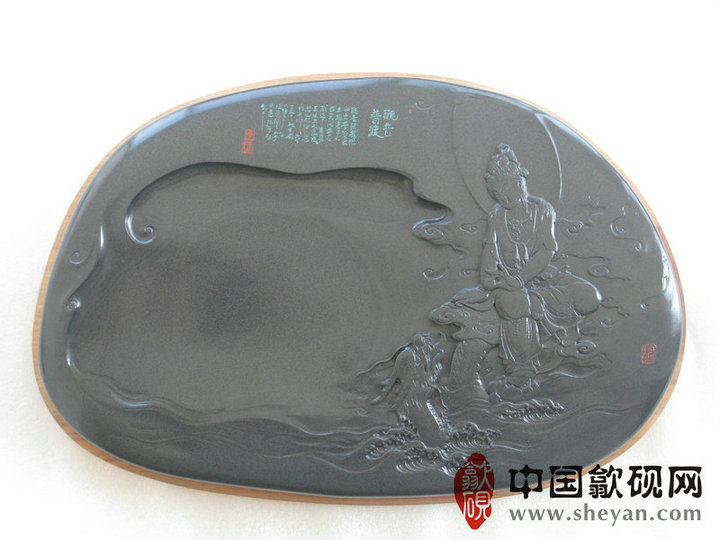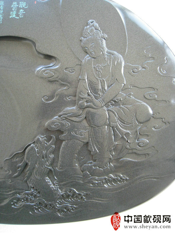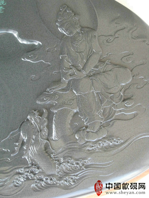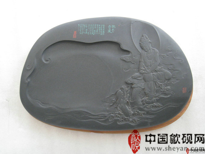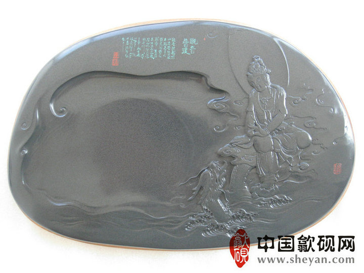【名称】观音普渡 【尺寸】长37.5厘米,宽24.5 厘米,厚4厘米 【石品】老坑青鱼子 【描述】正宗老坑出品,尺寸非常厚实,砚上鱼子分布均匀,砚石毫无任何瑕疵,扣之金声,呵气成珠,下墨如飞,发墨如油,也是大师雕刻工艺,人物细致,体态端庄祥和,坐骑神龙雕刻也是相当漂亮,薄意雕刻之超高境界!传世之精品! 【包装】精装木盒