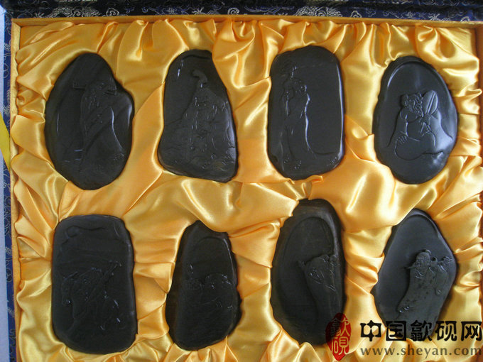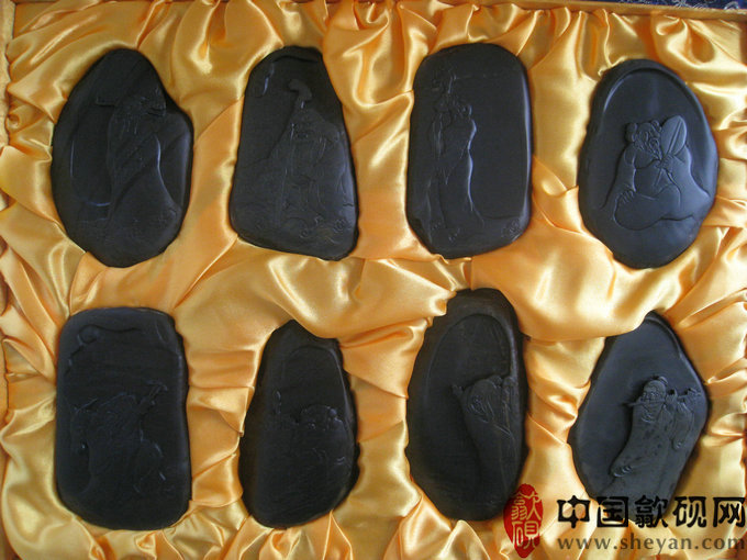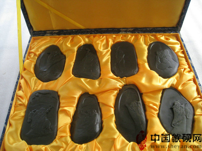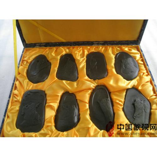 【名称】八仙过海礼盒装 【尺寸】长45厘米,宽35厘米,厚7厘米(每方小砚约12X10X1.5) 【石品】老坑金星 【描述】 【包装】精装锦盒
