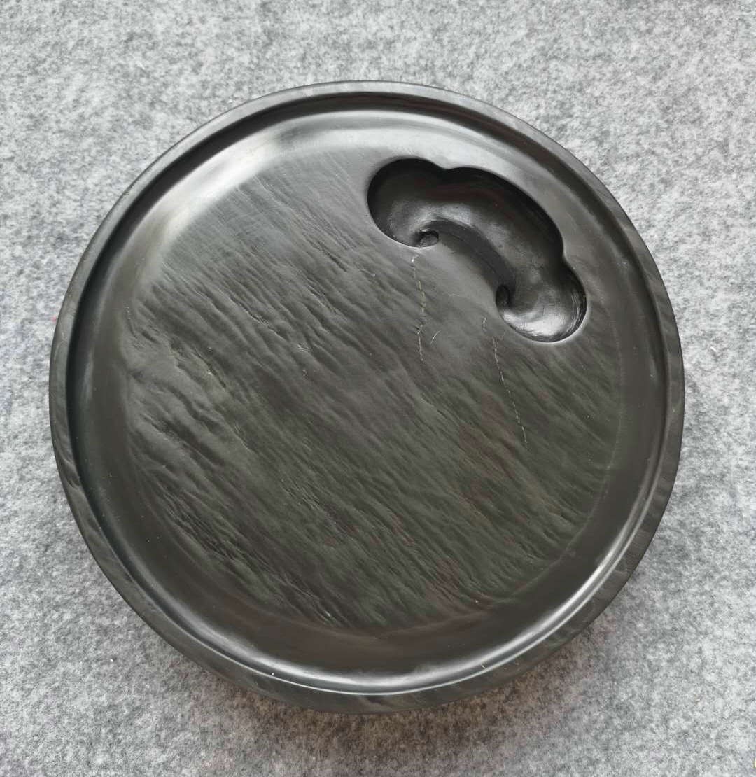 【名称】眉纹如意圆砚 【尺寸】直径20厘米,高5.5厘米 【石品】眉纹 【描述】漂亮的眉纹,歙砚中的经典必收藏纹理,似波澜起伏似烟波浩渺,又似云雾飘渺,仙境之感。此砚石质细腻莹润,造型古朴,下发墨好,实用收藏之佳品! 【包装】精装锦盒
