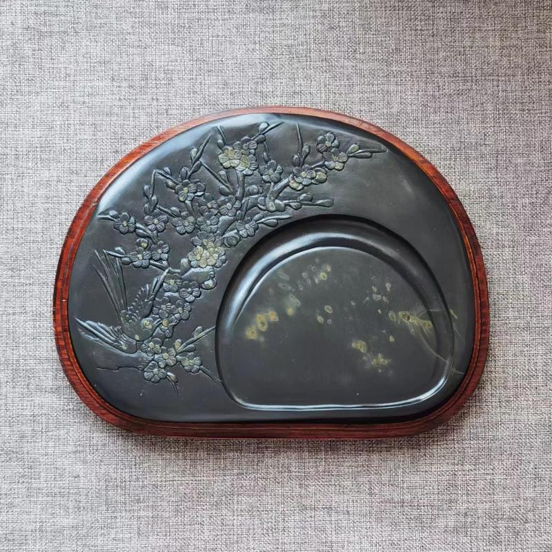 【名称】喜上眉梢 【尺寸】25cm*19cm*2cm 【石品】水浪金晕 【描述】漂亮的金晕纹理,精美的雕刻,寓意好收藏实用之佳品! 【包装】木盒