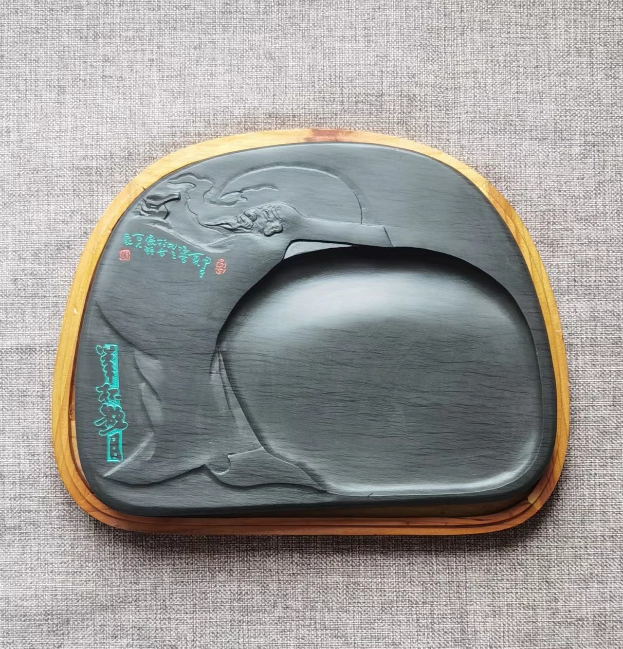 【名称】举杯邀明月 【尺寸】长25厘米,宽20厘米,高2.5厘米 【石品】水波纹 【描述】 【包装】精装木盒