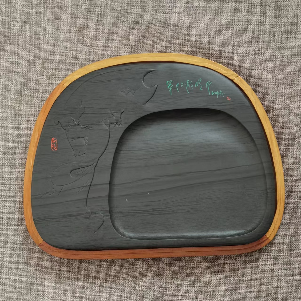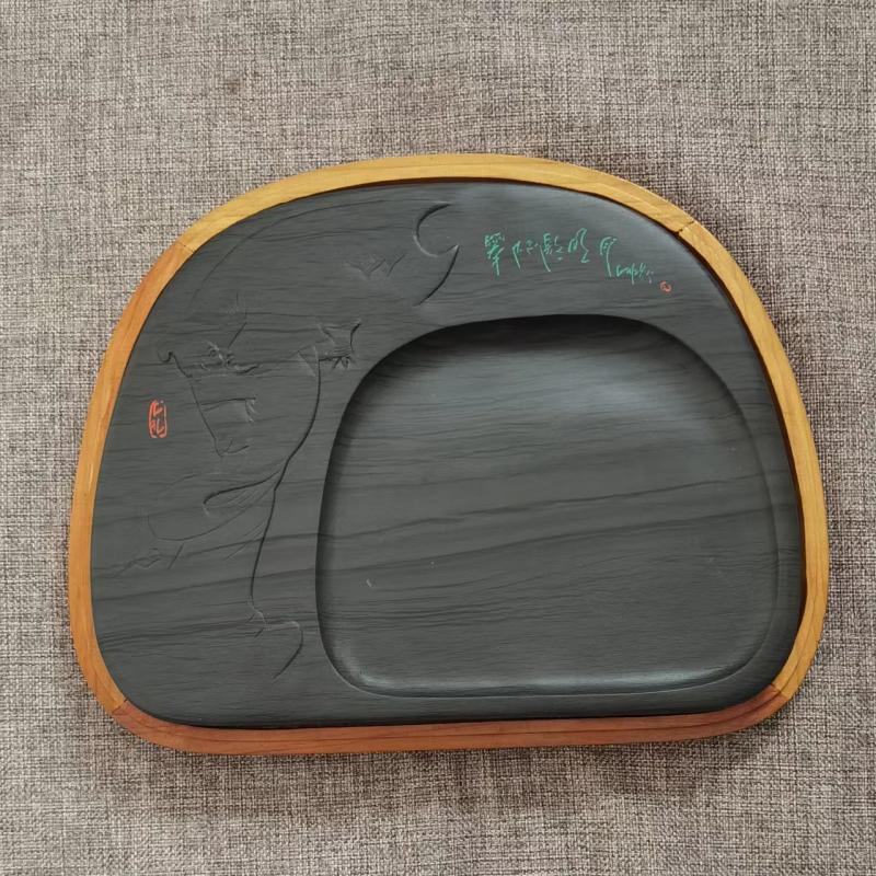 【名称】举杯邀明月 【尺寸】长25厘米,宽20厘米,高2.5厘米 【石品】水波纹 【描述】 【包装】精装木盒