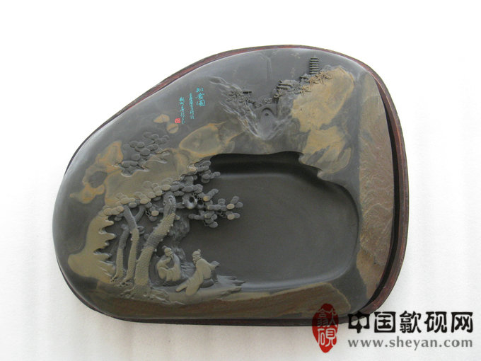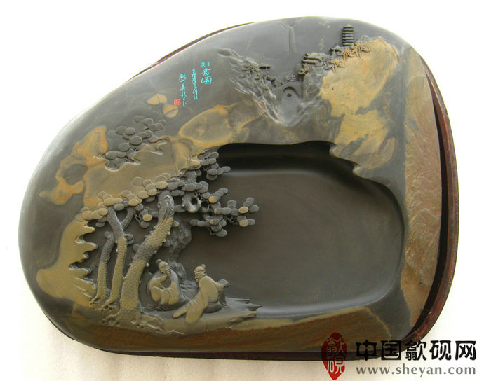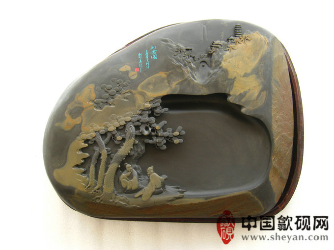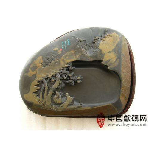 【描述】砚石浑厚大气,金晕独特而不失韵味,秋山林间,溪流潺潺,庙宇巍峨,二人松下抚琴论道,“高山流水觅知音”正得应景。意境绝佳,收藏送礼之佳砚