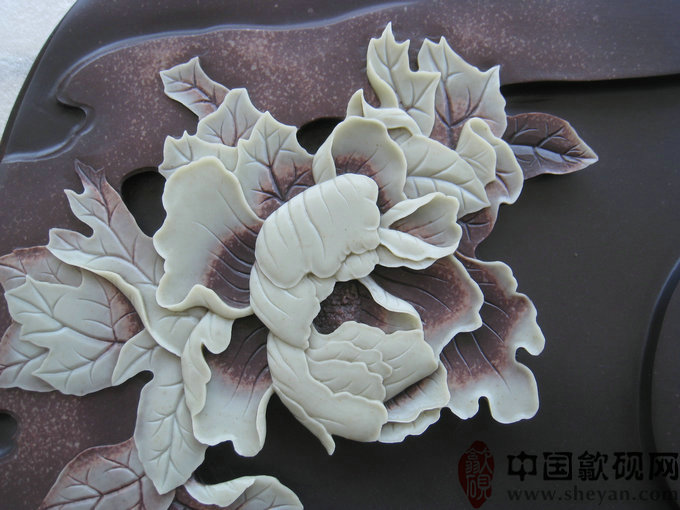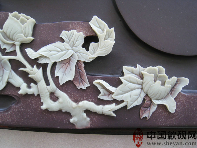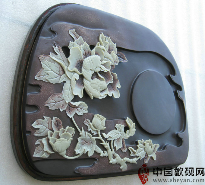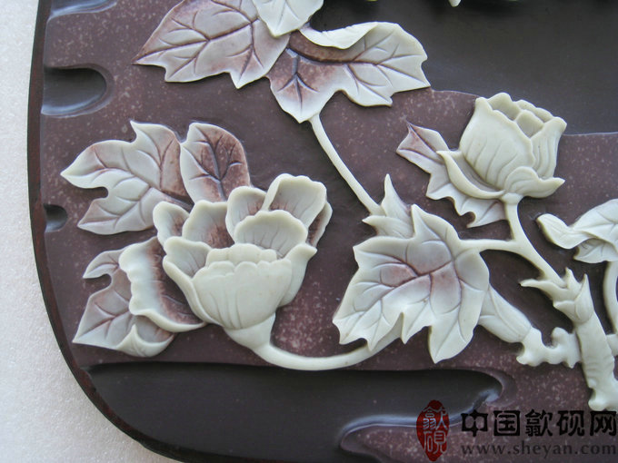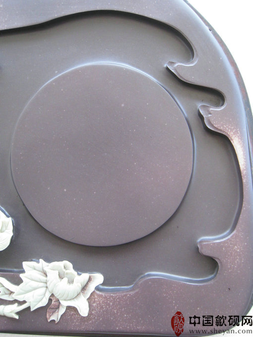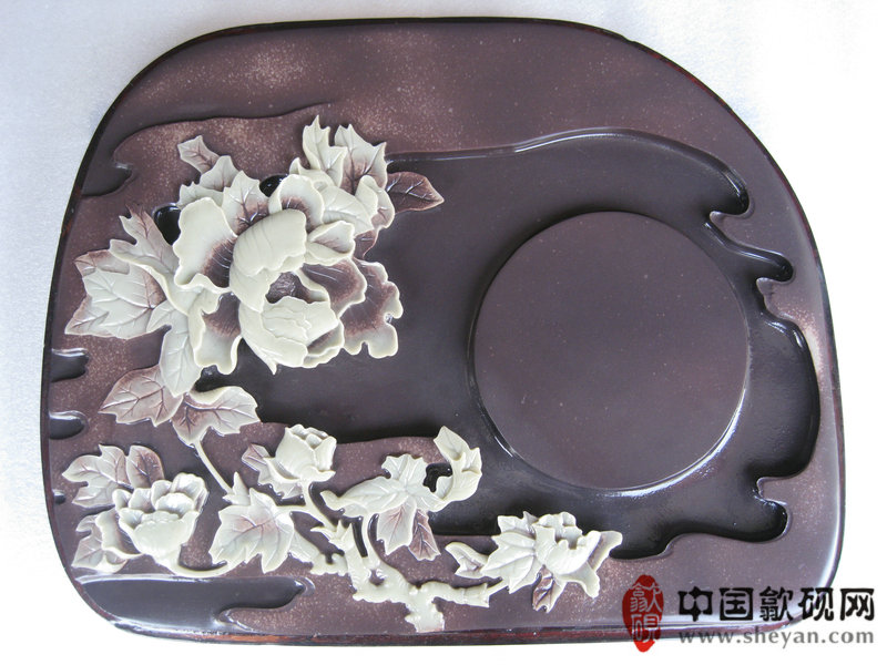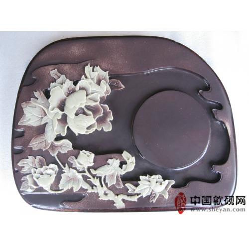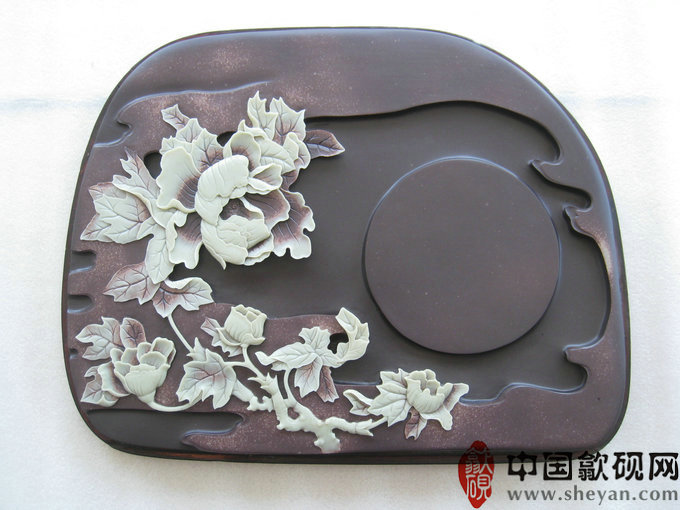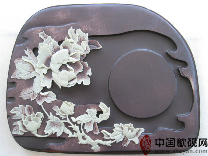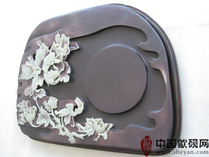 【描述】紫色与玉色的完美结合,加之精湛的雕工,呈现出一幅国画般的富贵牡丹国色天香图。她宛如一幅画卷向世人展现出牡丹的花开正茂,艳压群芳,雍容华贵的独特气质。观砚上花开正艳的牡丹,仿佛还能嗅到阵阵暗香浮动,意境绝佳,收藏送礼之佳品!!