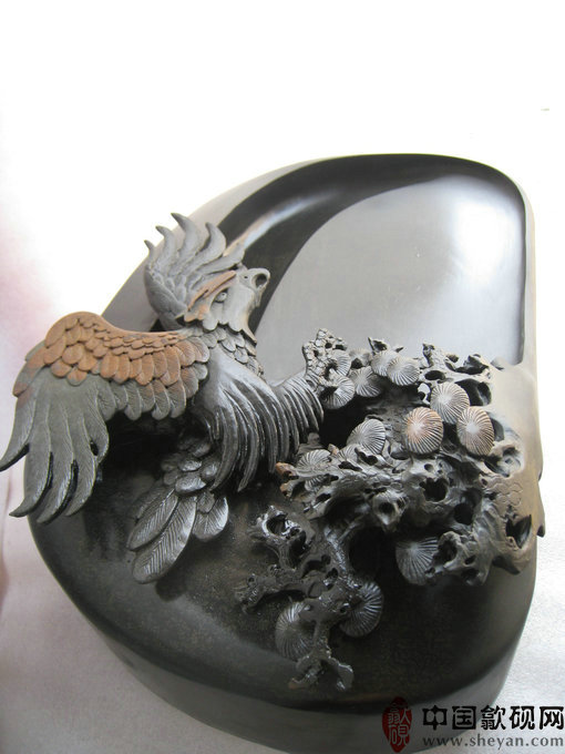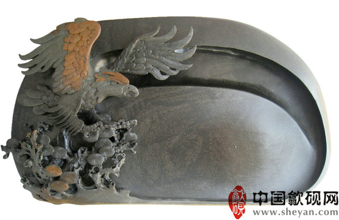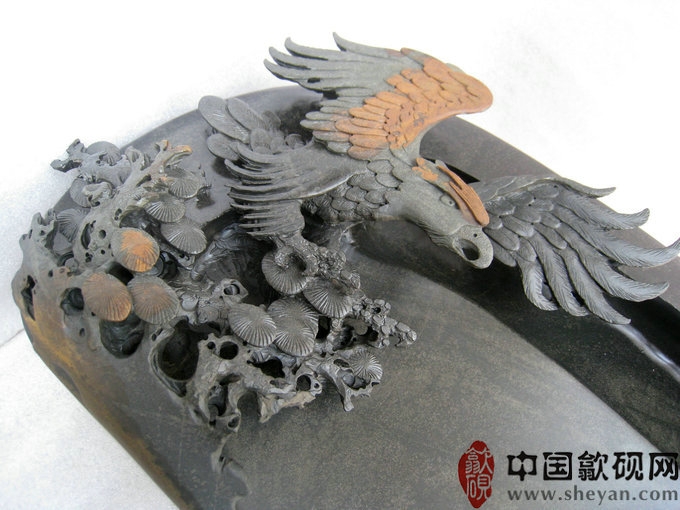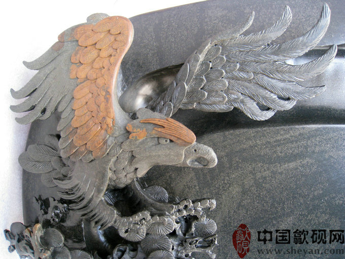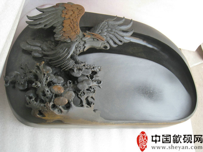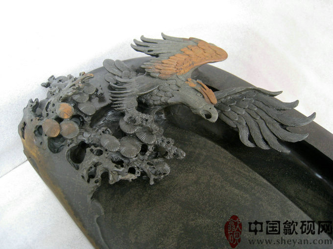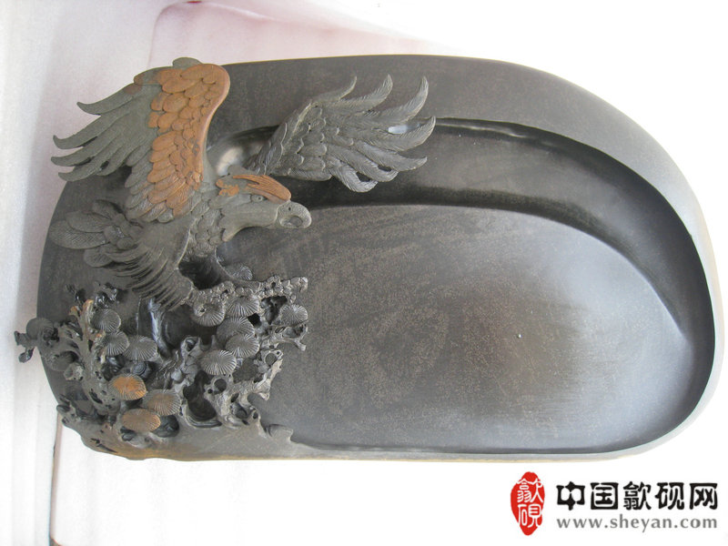 【描述】此砚鱼子金晕纹理十分美妙,雕工细腻,一雄鹰展翅立于山巅云端古松之上,正欲高飞,有君临天下王者风范,气势磅礴,视觉震撼!雄鹰羽翼丰满十分精细,朝阳之辉洒落雄鹰点点金,天人合一意境绝佳!收藏实用送礼之精品佳砚 【包装】精装木盒