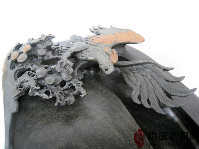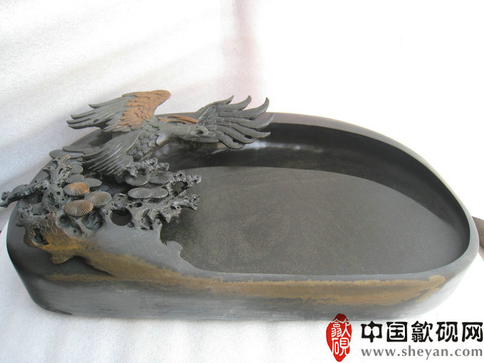 【名称】雄鹰展翅 【尺寸】长45厘米,宽26厘米,高12厘米 【石品】金晕 【描述】此砚鱼子金晕纹理十分美妙,雕工细腻,一雄鹰展翅立于山巅云端古松之上,正欲高飞,有君临天下王者风范,气势磅礴,视觉震撼!雄鹰羽翼丰满十分精细,朝阳之辉洒落雄鹰点点金,天人合一意境绝佳!收藏实用送礼之精品佳砚 【包装】精装木盒 【联系】QQ:550559188 【手机】1860 8866 188