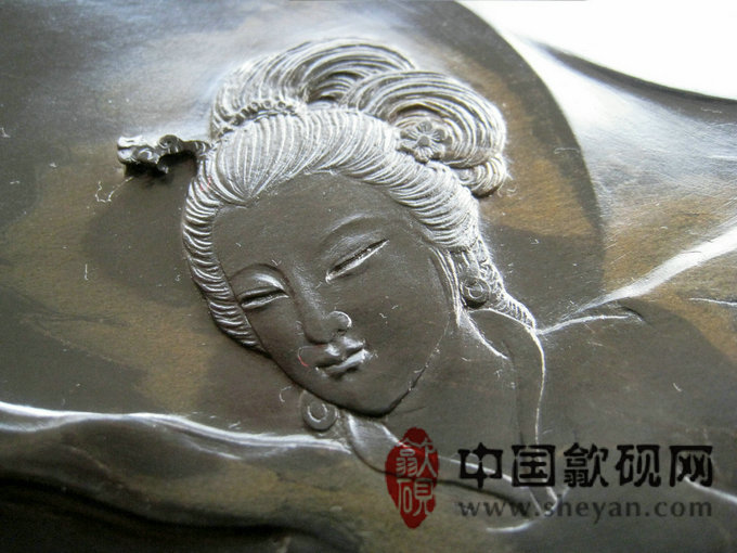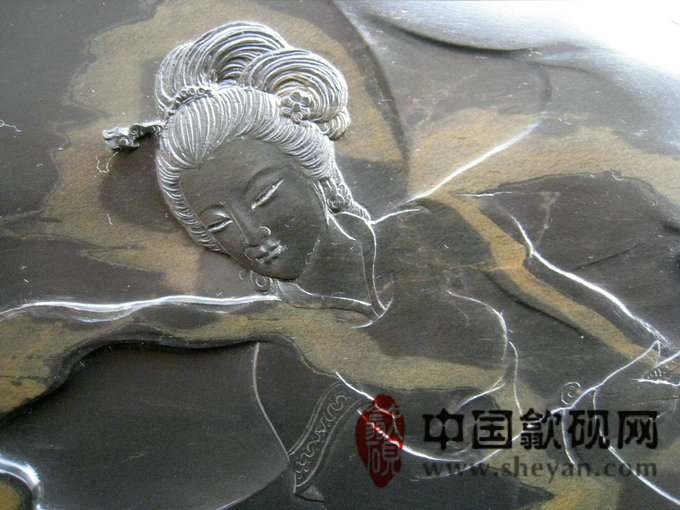 【名称】仙子舞月图 【尺寸】长53厘米,宽30厘米,厚6.6厘米 【石品】水坑金雾,黑底质,包石 【描述】正宗水坑出品,尺寸非常厚实,砚上金雾,酷似仙境,加之大师级的雕刻工艺,仙子舞月之意境,跃然石上,非常漂亮,薄意雕刻之超高境界!传世之精品! 【包装】精装香樟木盒